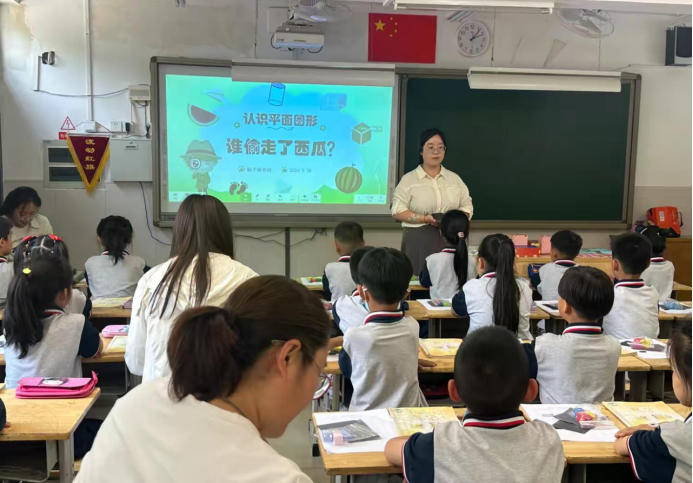 宫尹小学耿子杨老师从学生感兴趣的绘本故事入手,通过布置任务“找到偷西瓜的人”,根据小偷留下的脚印线索,引导学生发现正方形、长方形的特点。学生兴趣浓厚,争先恐后地探索展示自己的发现。在动手操作、展示、交流的教学环节中,学生认识了平面图形并发现了各自特点,在轻松愉悦的氛围中达到了教学目标。