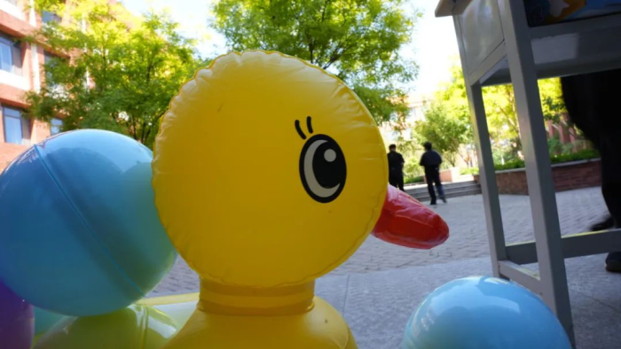 师生在活动场地范围内寻找失散的小黄鸭,然后将小黄鸭送到鸭妈妈怀抱即可获得一次抽奖机会。