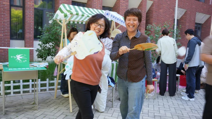 师生们在制作过程中,笑容洋溢。尤其是漆扇制作这项中国传统非遗艺术受到广大师生的欢迎,在盛满水与颜料的桶中轻轻一转,一把独属于自己的不可复制的扇子就完成了。