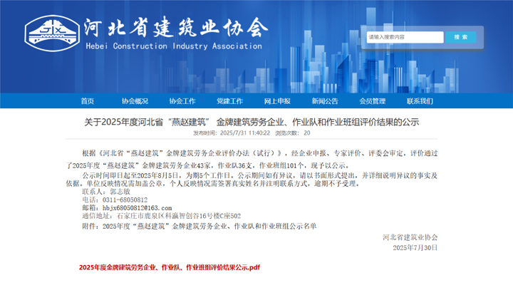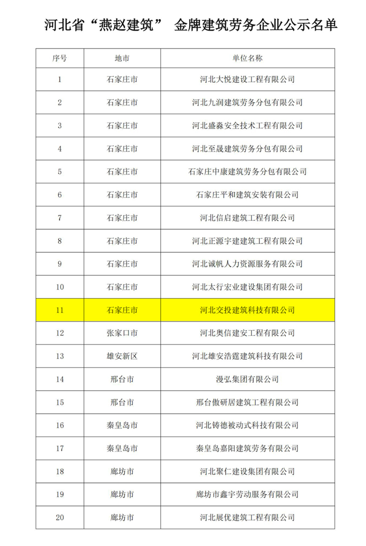 7月30日,河北省建筑业协会公示了2025年度“燕赵建筑”金牌建筑劳务企业名单,河北交投建筑科技有限公司(以下简称“建筑公司”)成功入选。