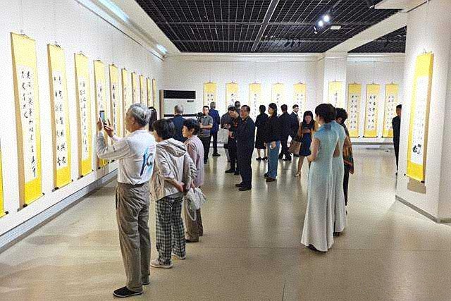 步入一展厅,孙雄先先生的以汉魏风骨为基的一幅幅力透纸背的书法作品,笔墨间似有金石铿锵之声;相邻展区,王海云先生的“海云猫”系列作品让人眼前一亮——三五成群的狸奴或嬉戏、或小憩,墨色浓淡相宜,猫儿们灵动的眼神仿佛在诉说一个个诗意的故事。画中猫咪蜷卧在宣纸折痕处,巧妙地将诗句意境化为视觉享受,引得观众纷纷拍照留念。