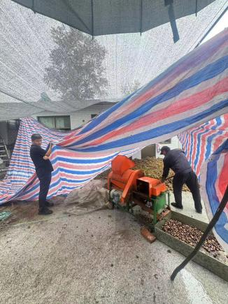 当天,阳泽信用社信贷员一行三人冒着淅淅沥沥的秋雨,前往当地板栗收购大户李大爷家中进行贷后回访。李大爷年近七旬,子女常年在外务工,家中板栗收购旺季时劳动力十分紧张。恰逢雨天,收购的板栗若不及时去皮处理,极易发霉变质。信用社工作人员在完成贷款用途核查后,发现李大爷正为大量板栗的去皮工作发愁,当即主动伸出援手。