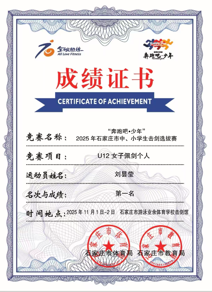 近日,由石家庄市体育局、教育局主办的“ 奔跑吧·少年” 2025年石家庄市第十届“ 市长杯” 击剑比赛圆满落幕。本次赛事吸引全市160名击剑小将同台竞技,石家庄市第十六中学初一四班刘昙莹同学代表石家庄市第十六中学出征赛场,凭借精湛的击剑技艺、沉稳的临场发挥与顽强的拼搏精神,一路过关斩将、力克强敌,最终勇夺冠军,为学校赢得了荣誉!少年自有凌云志,不负韶华逐梦行。一直以来,石家庄市第十六中学坚持 “五育并举” 育人理念,积极搭建多元化体育竞技平台,鼓励学生发展兴趣特长、锤炼意志品质,助力每一位学子全面发展、绽放光彩。也祝愿刘昙莹同学在未来的击剑之路上步履不停,绽放属于自己的光彩,再创辉煌,为校争光!(徐清 武利华)