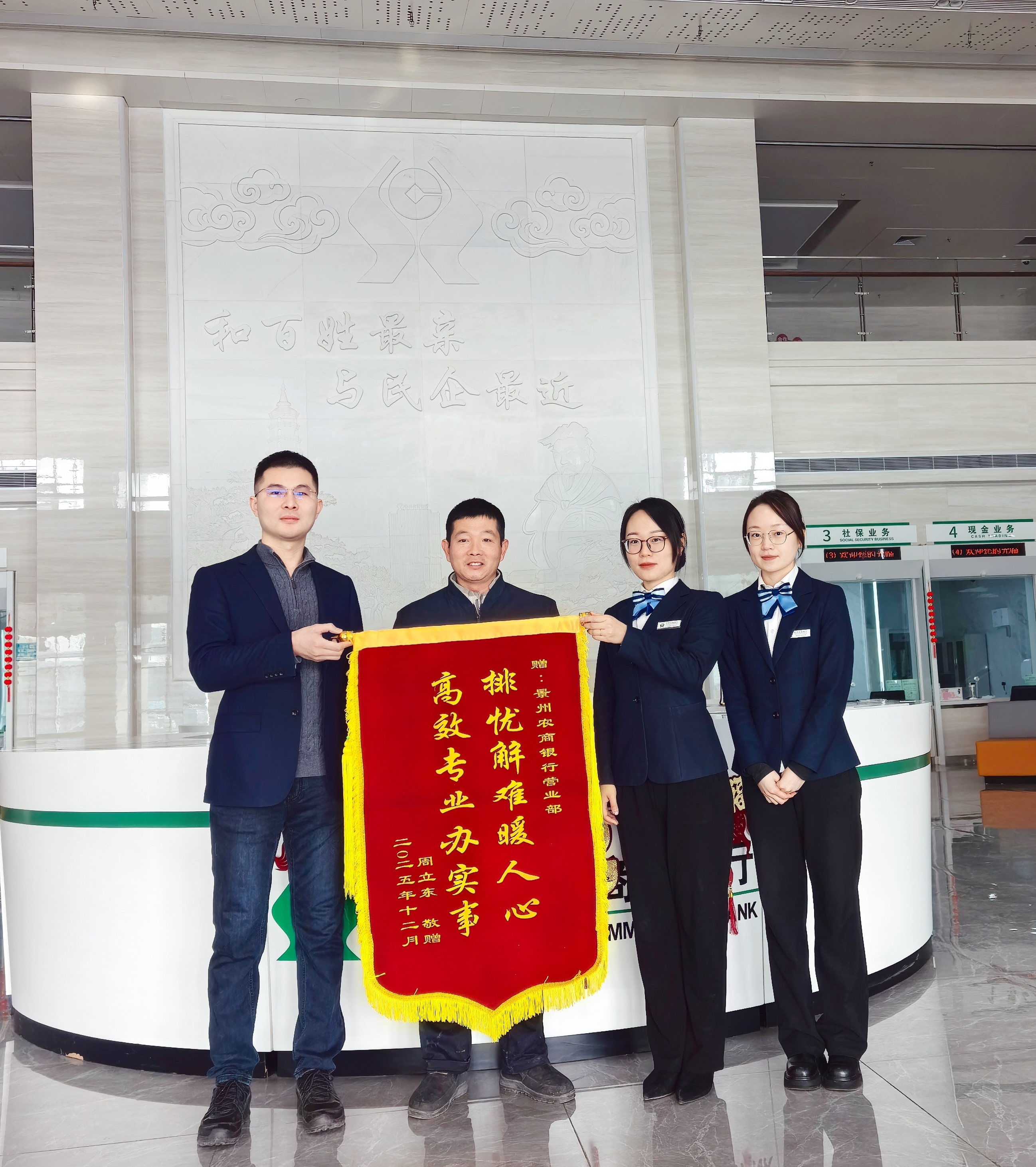 当得知业务全部办理完毕,自己父亲的资金可以正常使用时,客户激动不已,反复向网点工作人员表示:“本来以为老人来不了柜台,这卡换不成,没想到你们这么快就帮我办成了业务,真是太感谢了!景州农商银行真是老百姓的贴心银行啊!”为表达这份感激之情,客户后续专程将一面锦旗送到网点,以此致谢工作人员的暖心服务。