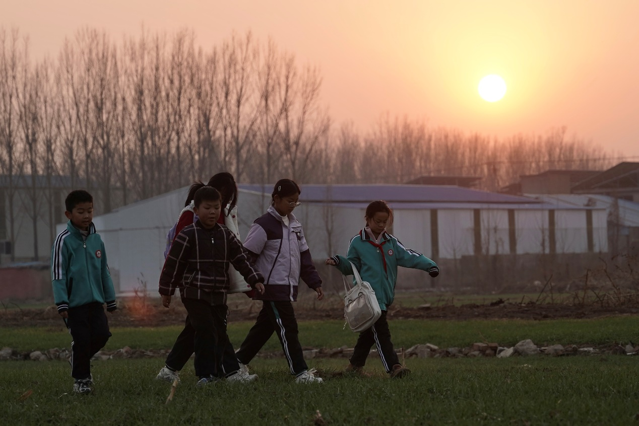 ▲夕阳西下,杭头村的孩子们放学了约着去图书馆看书。胡弘彪|摄