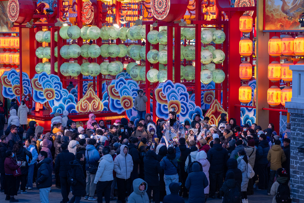 1月10日,唐山市河头老街景区灯火璀璨,游人如织。