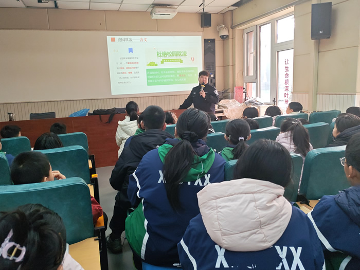 课堂上,张泽警官深入浅出普及法律常识,重点剖析未成年人不良行为的表现与危害,细致阐释从不良行为到违法犯罪的渐变轨迹,厘清违法与犯罪的界限,并详解未成年人违法犯罪处罚年龄规定。期间,警官带领学生观看未成年管教所实景视频与涉事未成年人忏悔录,真实画面直击心灵,让孩子们在直观感受中提升法律意识,催生严于律己的自觉,将遵纪守法的理念深植心间。