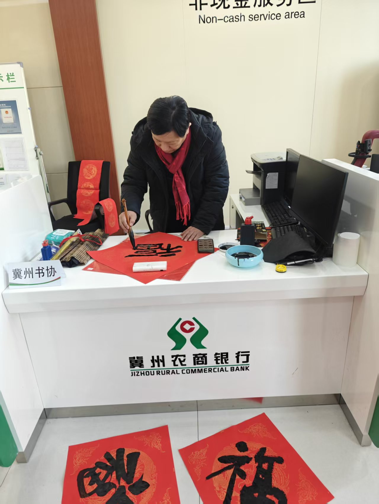 新春将至,年味渐浓。为弘扬中华优秀传统文化,回馈广大客户长期以来的支持与信赖,近日,冀州农商银行信都东路支行精心组织“写春联・送福字” 迎新春主题活动,特邀冀州区书法协会会员到场,用遒劲笔墨书写美好期许,为广大新老客户送上最真挚的新春祝福。