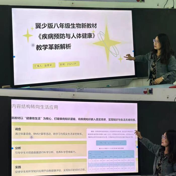 初二生物备课组围绕2024年秋季启用的冀少版八年级上册生物教材,开展专题教研活动,聚焦“疾病预防与人体健康”单元的教学革新。活动中,赵竞宇老师深入剖析新教材亮点:其打破传统知识灌输模式,以“调查-实践”为主线,融入BMI计算、传染病防控方案设计等生活化活动,还明确“三减三健”健康理念,强化核心素养培养。结合我校学情,教师们还研讨确定“开发基础知识补缺包”“创新过程性评价”等教学策略,为提升课堂实效、培育学生健康素养筑牢基础。
