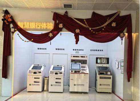 “智慧银行体验”区域标识醒目。多台智慧柜员机一字排开,与智能现金柜台、征信自助查询机等设备共同构成高效服务矩阵,覆盖从常规业务办理到信用报告查询的多元化需求。每台设备上方均清晰标注“河北省农村信用社”,强化品牌信赖感,功能分区明确。“现金业务”与“非现金业务”窗口分开设置,引导客户快速分流,减少等待,在秩序井然中体现服务的专业与细致。