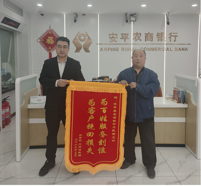 锦旗是荣誉,更是责任。下一步,安平农商银行将继续秉持“手握手的承诺、心贴心的服务”理念,把诚信服务、暖心服务融入每一笔业务、每一个细节,切实为广大客户提供更安全、更便捷、更贴心的金融服务,做百姓信赖的“贴心银行”!(通讯员 刘贺)