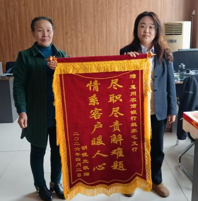 这面锦旗,不仅是一份赞誉,更是冀州农商银行魏家屯支行优质服务的生动写照。客户在亲身感受高效贴心的服务后,主动将暖心经历分享给邻里乡亲,让“魏家屯支行服务好、办事靠谱”的口碑在当地广为流传,赢得了周边群众的一致认可。这份来自群众的信赖,为魏家屯支行深耕本土、服务民生筑牢了根基,也充分彰显了金融机构扎根地方、心系群众、为民解忧的责任与担当。(通讯员 史博江)