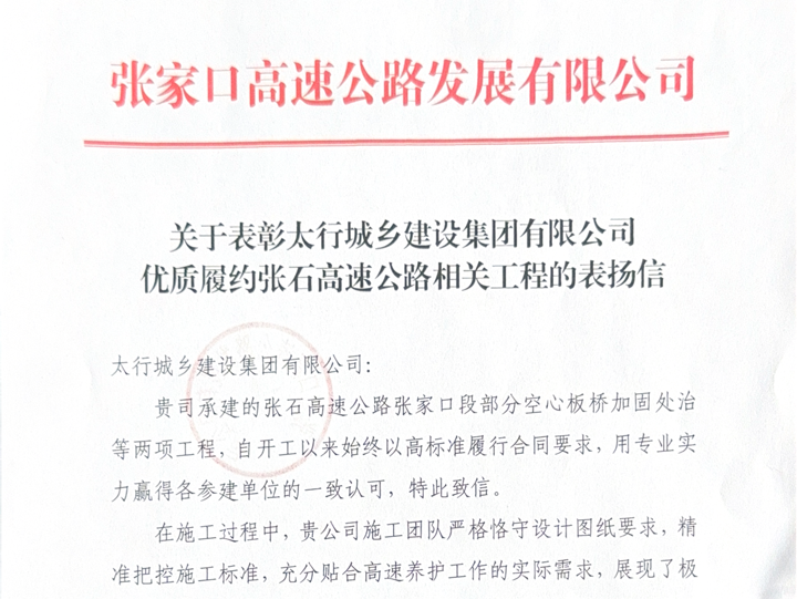 张石高速公路项目荣获专项表扬信