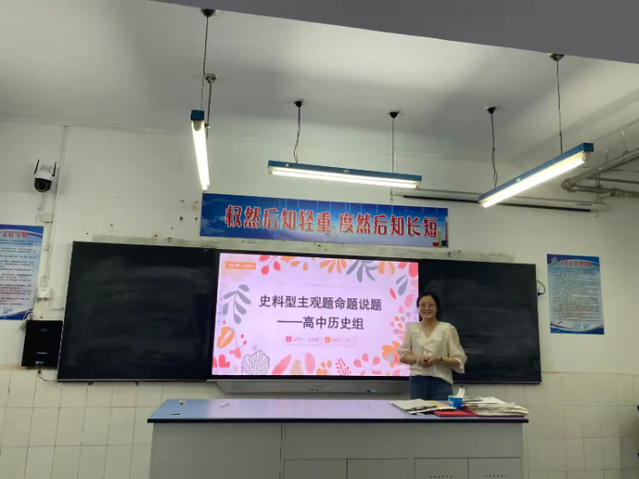 张婷婷和梁昱菲两位老师作为本次教研活动的主研人。首先,张婷婷老师以法国大革命和拿破仑帝国时期对法国工业化的意义为主题,分别从命题立意(包括核心目标、能力考察、素养渗透、热点链接)、命题背景、试题对应课程标准和试题分析四个方面进行了关于高中历史学科史料型主观题的命题说题。其次,梁昱菲老师也定位于主观题命题,以神舟二十号的成功发射为背景材料,由点到面,情境延伸至载人航天精神所发挥的作用,知识聚焦于必修四文化部分,涉及知识点有文化的作用、中华民族精神的作用、社会主义核心价值观的作用等,说题围绕试题剖析、试题立意、教学启示三个方面展开论述。
