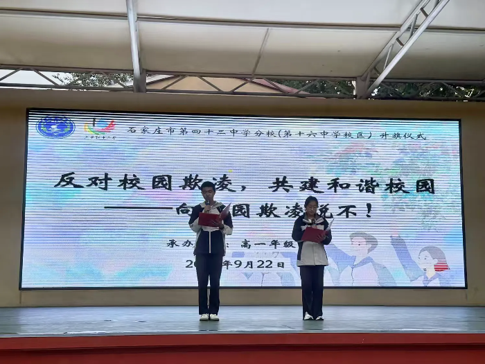 2025年9月22日,石家庄市第四十二中学(第十六中学校区)举办了一场以《反对校园欺凌 共建和谐校园——向校园欺凌说“不”!》为教育主题的升旗仪式。