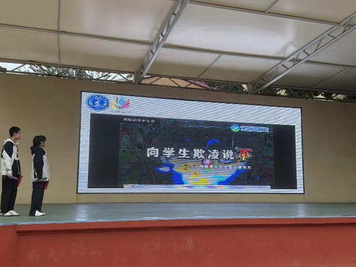 学生代表高一2班李梦菲,薛康硕同学以“对校园欺凌说“不”为主题进行发言。发言中强调了校园欺凌对受害者身心的危害,呼吁全体同学树立正确的是非观,坚决抵制欺凌行为,主动关心和帮助身边同学,共同营造友爱、和谐的校园氛围。