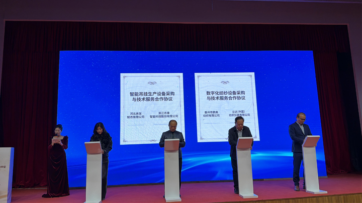 活动现场举行重点合作项目签约仪式。河北奔发制衣有限公司与浙江衣拿智能科技股份有限公司签订智能吊挂生产设备采购与技术服务协议;晋州市鹏奥纺织有限公司与立达(中国)纺织仪器有限公司签订数字化纺纱设备采购与技术服务协议。