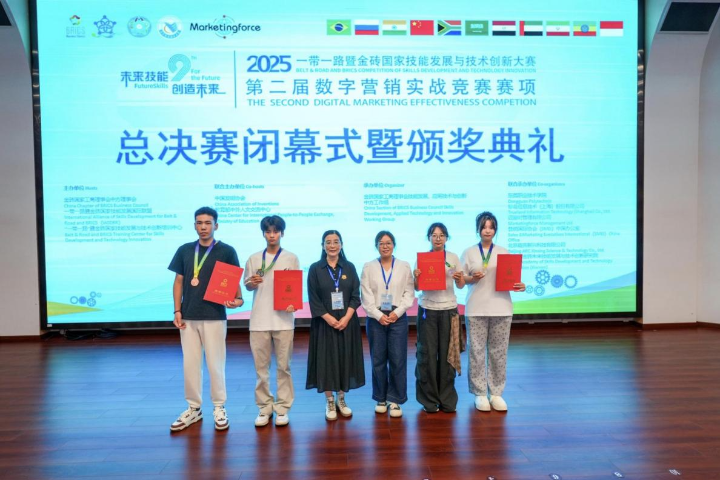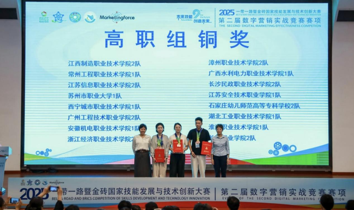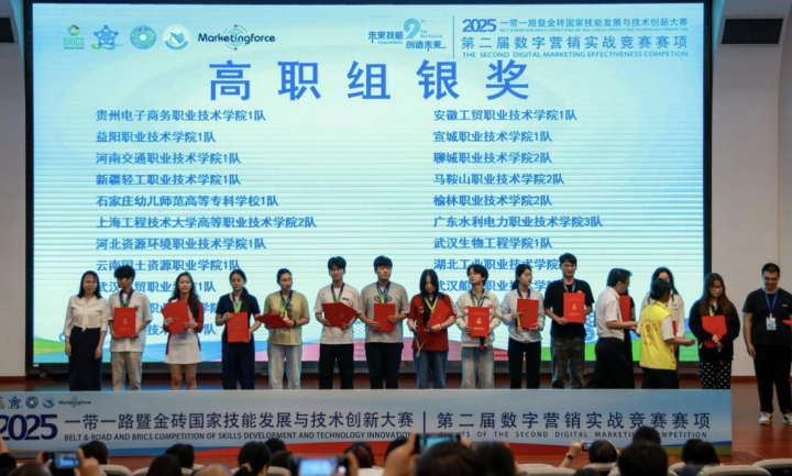 2025“一带一路”暨金砖国家技能发展与技术创新大赛第二届数字营销实战赛项总决赛在东莞职业技术学院举行。石家庄幼专应用技术系选派的两支学生代表队参加了总决赛的激烈角逐,李国丽、杨高凯学生团队荣获高职组银奖,张均正、马子烜学生团队荣获高职组铜奖,魏建红、董丽娟两位教师荣获“优秀指导教师奖”。