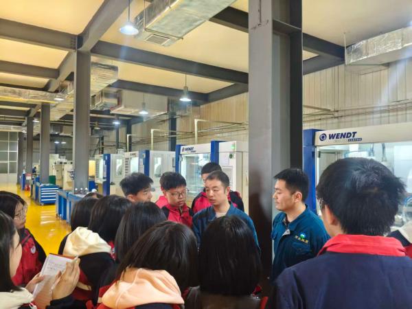 在公司经理与技术主管的分批带领下,学生们通过风淋室进入生产核心区域,开启了全方位的车间探秘之旅。混合料车间、烧结车间、模具车间、压制车间、实验室、CVD 车间等多个关键生产环节依次呈现,国际一流的全自动数控智能装备、整洁有序的生产环境让学生们驻足惊叹。透过透明观察窗,晶体生长炉等高科技设备的精准运作一目了然,学生们详细了解到硬质合金从碳化钨、钴等原料出发,经科学配比、精准压制、1200℃以上高温烧结、精密磨削及涂层处理等多道工序,最终成型为工业刀具的全过程。在 CVD 车间,技术人员重点介绍了定制化多层复合纳米结构涂层工艺,其对刀具耐磨与抗冲击性能的显著提升,让学生们直观感受到科技创新的核心价值。此外,车间内严格控制的温度、湿度与洁净度标准,也让学生们深刻体会到精密制造业对细节的极致追求。