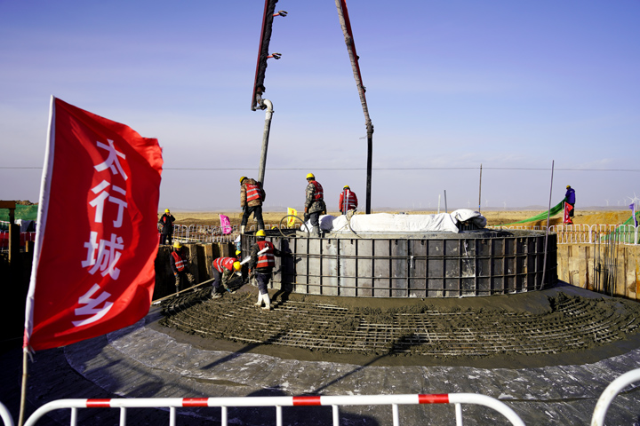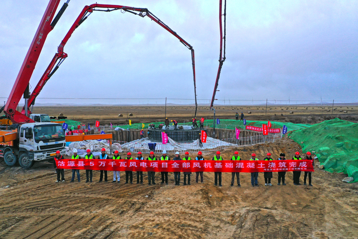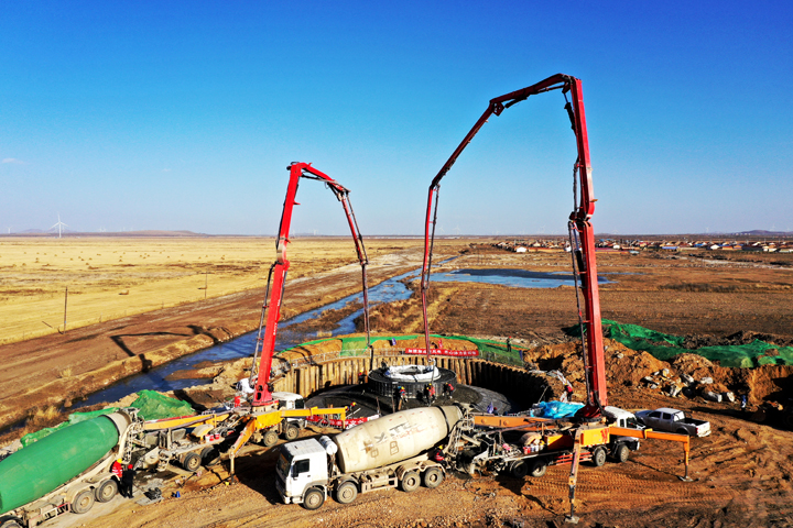 “针对沽源冬季低温、多风的极端气候,项目团队制定专项施工方案。在材料选用上,全部采用高标号“C40-F200-P6”早强防冻混凝土,通过优化配比掺加抗裂纤维(即螺放形聚乙稀醇纤维),既能防渗水又提升抗冻性,确保基础在零下30摄氏度的环境下仍具备强耐久性。”项目负责人介绍说,在施工过程中,项目团队创新采用 “分层浇筑、斜面推进”工艺,配置5台混凝土搅拌车和2台泵车同步作业,每台基础浇筑连续作业时长超8小时,振捣手、质检员、安全员分工协作,实时监测坍落度与温度数据,全程实现 “零差错” 管控。