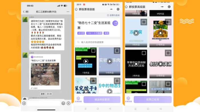 11月18日19:00—19日22:30 ,赵慧姝老师将群投票小程序发至班级群,要求学生认真观看视频后投出宝贵的5票。通过投票,把课堂搬到了厨房、超市、奶茶店乃至浴室的镜面,让“物态变化”真正在学生的日常生活里“活”了起来。
