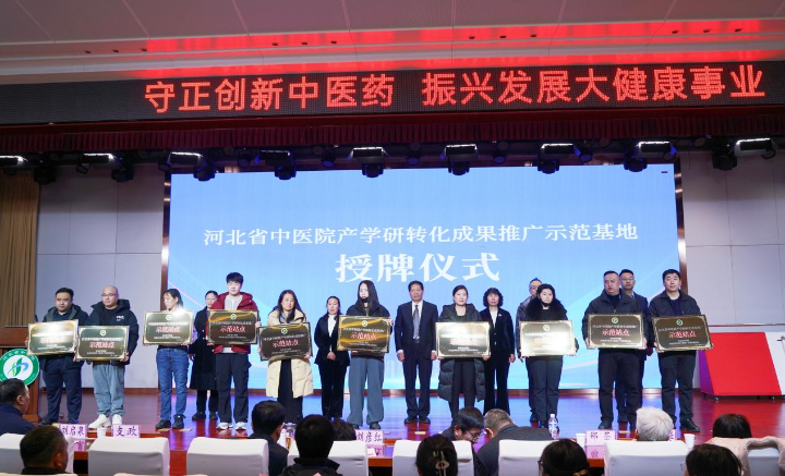 河北省中医院为安国市中医院、邯郸市永年区中医院、保定望都县医院等12家基层公立医院代表授牌“产学研转化成果推广示范基地”,为邯郸医药大厦、北国大药房等16家药店、养生机构大健康企业代表授牌“产学研转化成果推广示范站点”。