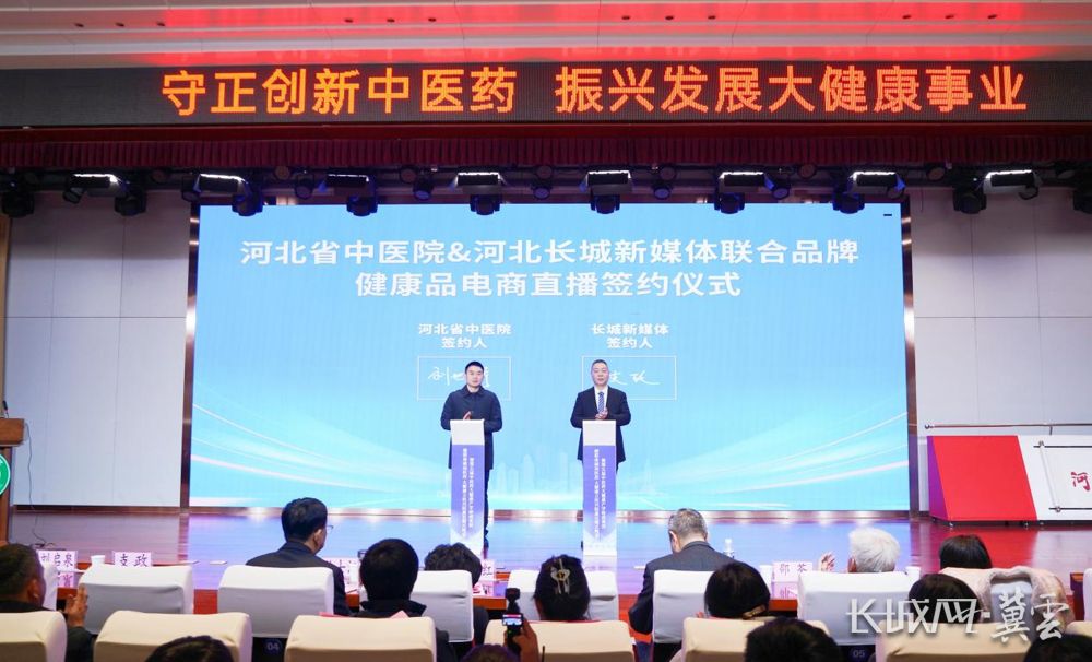 会议现场,河北省中医院党委副书记、院长支政和河北长城新媒体文化发展有限公司总经理刘世柠共同签署“河北省中医院与河北长城新媒体联合品牌健康品电商直播”合作协议,正式达成战略合作。