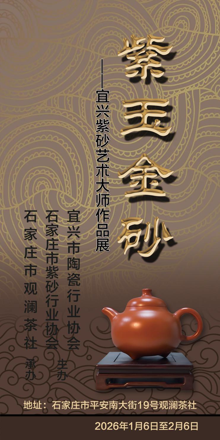为活跃省会石家庄元旦和春节期间的群众文化生活,增强城市活力和文化多元影响力,由石家庄市紫砂行业协会、宜兴市陶瓷行业协会联合主办,石家庄市观澜茶社承办的“紫玉金砂”——宜兴紫砂艺术大师作品展,将于2026年1月6日至2月6日在石家庄观澜茶社举办,诚邀各界人士共赏匠心佳作,品紫砂雅韵,赴一场陶土与匠心的文化之约。