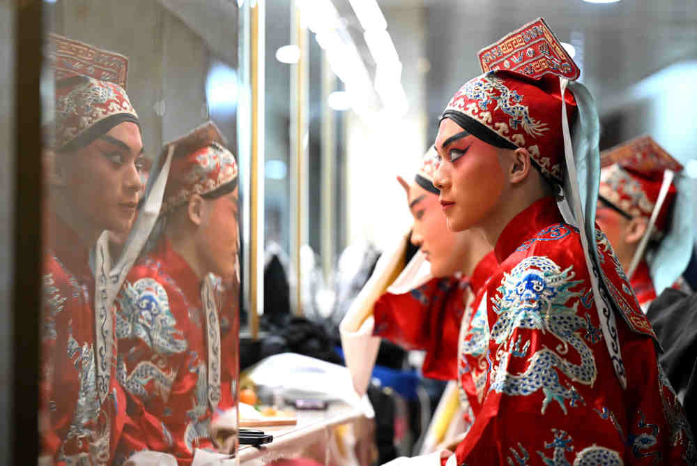 ↑ 1月25日晚,中国戏曲学院演员在河北省石家庄市人民会堂表演京剧《龙凤呈祥》前试装。新华社发(陈其保 摄)
