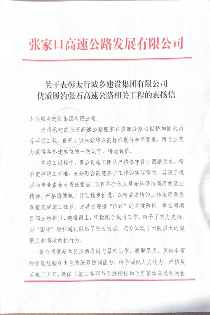 1月29日,太行城乡建设集团所属的应急公司收到来自张家口高速公路发展有限公司的专项表扬信。信件以严谨的表述、真切的情感,对公司项目团队在张石高速公路工程项目中展现的国企担当、专业实力与民生情怀给予高度赞誉,为全体干部职工注入了奋进新征程的强大精神力量。