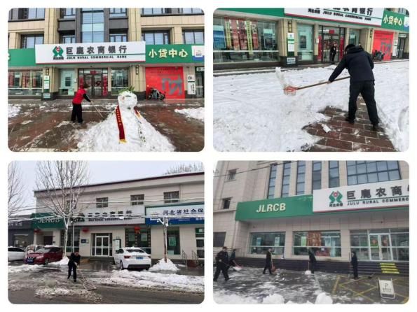巨鹿农商银行员工手持铁锹、扫帚等工具,分工明确、默契协作,重点对网点门前通道、院内、周边人行道及周边主要通行路段的积雪进行集中清理。大家不畏严寒、干劲十足,挥舞工具破冰除雪,不放过任何一处易滑隐患,经过通力协作,成功清理出安全畅通的通道,为前来办理业务的客户以及过往群众扫清了出行障碍。