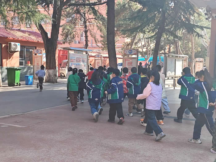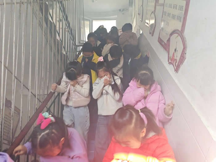 当天下午,一场紧张有序的消防安全逃生演练在校园内展开。模拟烟雾悄然弥漫,尖锐的警报声划破宁静。启智楼内,孩子们在老师的沉着引导下,迅速弯腰捂鼻,沿着既定逃生路线快速撤离,短短几分钟便全部抵达校园甬路的安全区域。