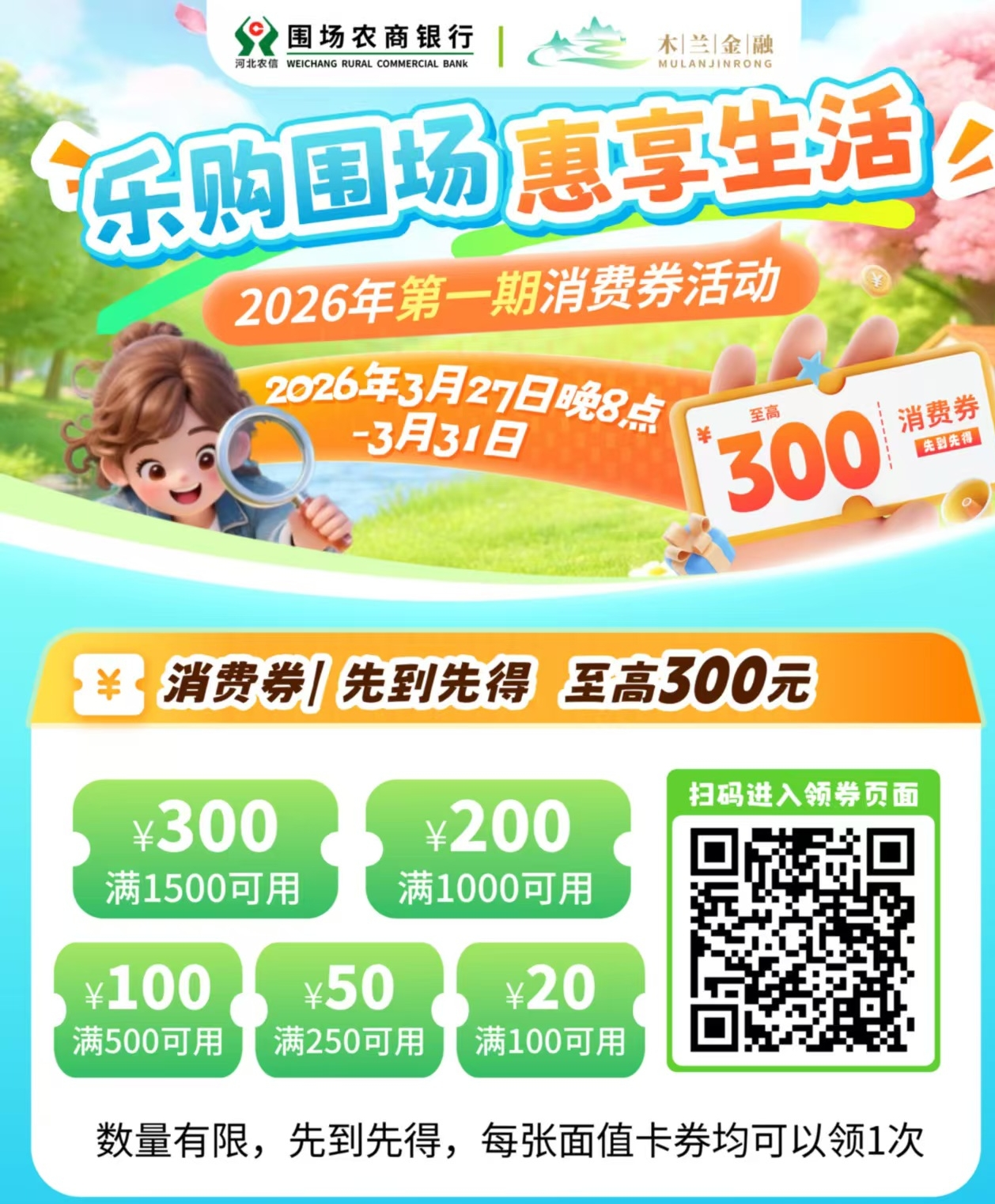 为深入贯彻落实扩大内需战略,充分激发县域消费潜力,围场农商银行与围场商务局于2026年3月27日联合开展了第一期“乐购围场·惠享生活”惠民促消费活动。本次活动以“乐购围场·惠享生活—政银企联动·全民嗨购”为主题,秉持“政府搭台、银行助力、企业让利、全民共享”的核心思路,通过围场农商银行“享惠木兰”平台发放电子消费券的形式,联动多方资源,有效激发县域消费潜力、提振市场信心,实现惠民、惠商、促经济多重成效。
