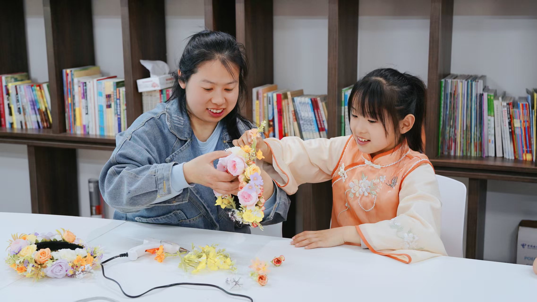 活动伊始,温馨有趣的亲子互动游戏拉开序幕,家长与孩子默契配合,模仿燕子飞舞、柳枝轻摇的姿态缓缓转圈,彼此相拥,在轻松愉悦的氛围中拉近心与心的距离,现场欢声笑语。随后,在工作人员与志愿者的细致指导下,大小朋友共同开启非遗簪花体验之旅,从精心挑选花材、搭配色彩层次,到巧手固定造型、雕琢细节,大手牵小手默契协作,一步步将零散花材变为精致典雅的簪花,在动手实践中感受传统技艺的独特魅力。制作完成后,家长和孩子互戴簪花,用质朴行动表达爱意与祝福。