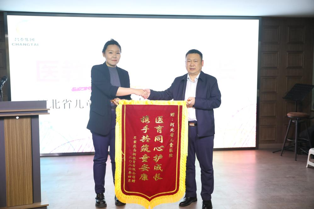 王莹代表高新教育有限公司向医院赠送锦旗,彰显医教双方携手守护儿童健康的坚定共识与合作初心。